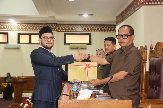 IJN – Meulaboh | Wakil Bupati (Wabup) Aceh Barat, Said Fadheil, SH mewakili Bupati Tarmizi, SP, MM, menyampaikan jawaban Bupati terhadap Pembahasan dan Penetapan Rancangan Qanun (Raqan) Kabupaten Aceh Barat Tahun Anggaran 2025 di ruang sidang utama DPRK Aceh Barat, Kamis 21 Agustus 2025.
