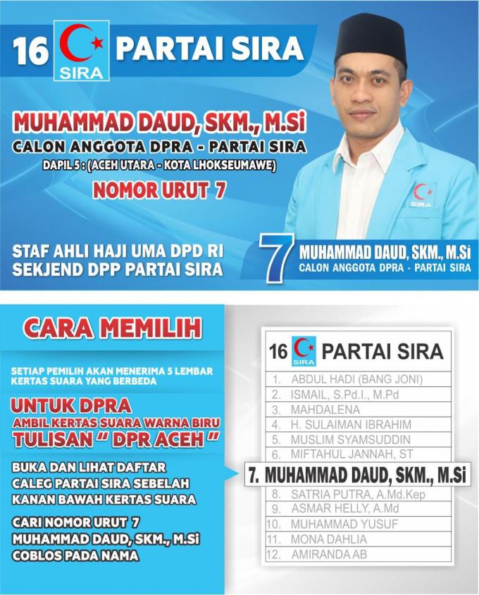 Bersaing dalam Pemilu 2019, Muhammad Daud ikut mencalonkan diri sebagai salah seorang Calon Anggota DPR Aceh melalui Partai SIRA Dapil Aceh 5 (Aceh Utara dan Lhokseumawe)